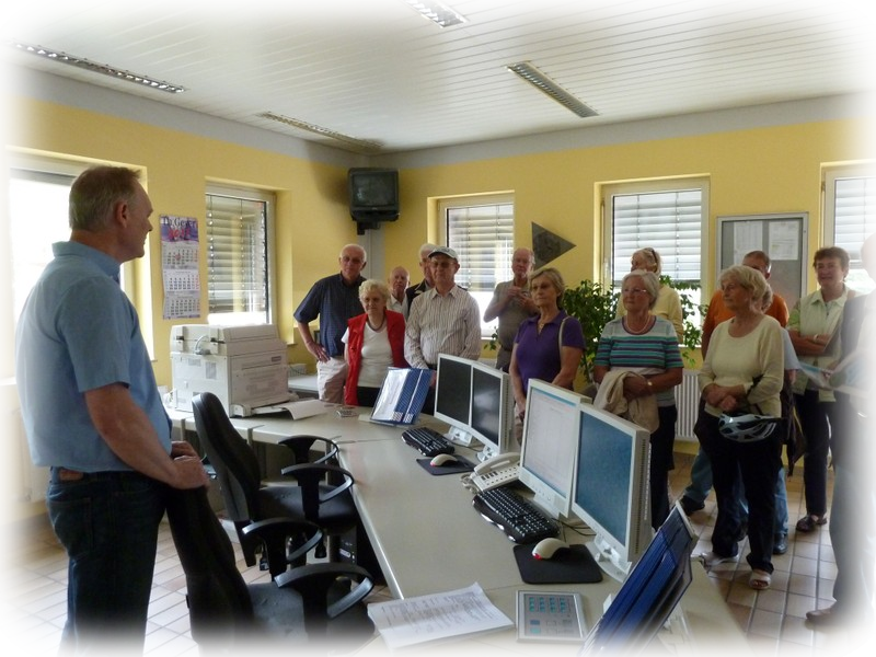 Aber auch den Spuren des Brauchwassers gingen die wissensdurstigen Senioren nach. Zwar durchliefen sie nicht persönlich die über 200 km langen Abwasserleitungen im Untergrund Niederkassels, ließen sich aber von Herr Seickfried alles genau an den Bildschirmen zeigen. Dort werden auch die Messsonden und damit die Vorgänge in den einzelnen Klärstufen überwacht: Die mechanische und die biologische Klärung in den Vorrats- und Rückhaltebecken. Neben der Schlammaufbereitung für die Landwirtschaft wird auch Biogas gewonnen. Am Ende der Reinigung fließt völlig klar aussehendes Wasser, das bis zu 90 % von Schadstoffen befreit ist, in den Rhein.