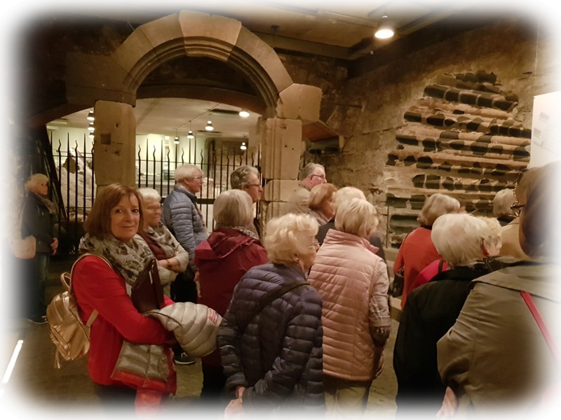 Beim Rundgang durch das Ausgrabungsgelände vorbei an mächtigen mächtigen Pfeiler-Fundamenten des Südturmes bis 16 m Tiefe, erbaut zwischen 1330 und 1360, erblickten wir vom Alten Dom den Westeingang mit Resten des Vorgängerhauses. Im Untergrund dieser Kirchen befanden sich Reste römischer Leitungen und die Fußbodenheizung eines römischen Privathauses – früher als Kirche gedeutet – dazu einen römischen Brunnen aus dem 4. Jahrhundert. In der Krypta wurden 1959 fränkische Grabanlagen einer jüngeren Frau und eines Knaben mit kostbaren Beigaben, vermutlich aus dem 6. Jahrhundert entdeckt. – Beeindruckt und mit Respekt für die Leistungen unserer Vorfahren verlassen die Besucher das Gebäude.