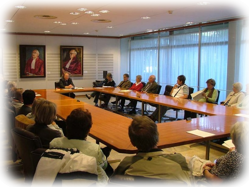 Auf der Rückfahrt gab es dann noch einen Informationsbesuch beim Bundesverfassungsgericht in Karlsruhe, den Dr. Hiegert mit praktischen , aus den Medien bekannten Fällen wie z.B. der Folterandrohung für den Entführer des Frankfurter Bankierssohnes sehr anschaulich gestaltete. Im Sitzungszimmer mit den eindrucksvollen Porträts der obersten Verfassungshüter erklärte er, dass seine Aufgabe auch die Weiterreichung solcher Klagen an den Gerichtshof in Straßburg sei.