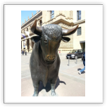 Bei kühlem, sonnigem Aprilwetter war das erste Ziel in Frankfurt schnell ausgemacht, denn Bulle und Bär, die zwei Bronze-Skulpturen als Symbol für die steigenden und fallenden Kurse, waren auf dem Börsenplatz als beliebtes Fotomotiv umlagert. Beide machten deutlich, dass es an der Börse oft „tierisch“ zugeht: der Bär haut mit seinen Tatzen von oben nach unten (Kurse gehen runter), der Bulle stößt umgekehrt mit den Hörnern von unten nach oben (Kurse steigen).