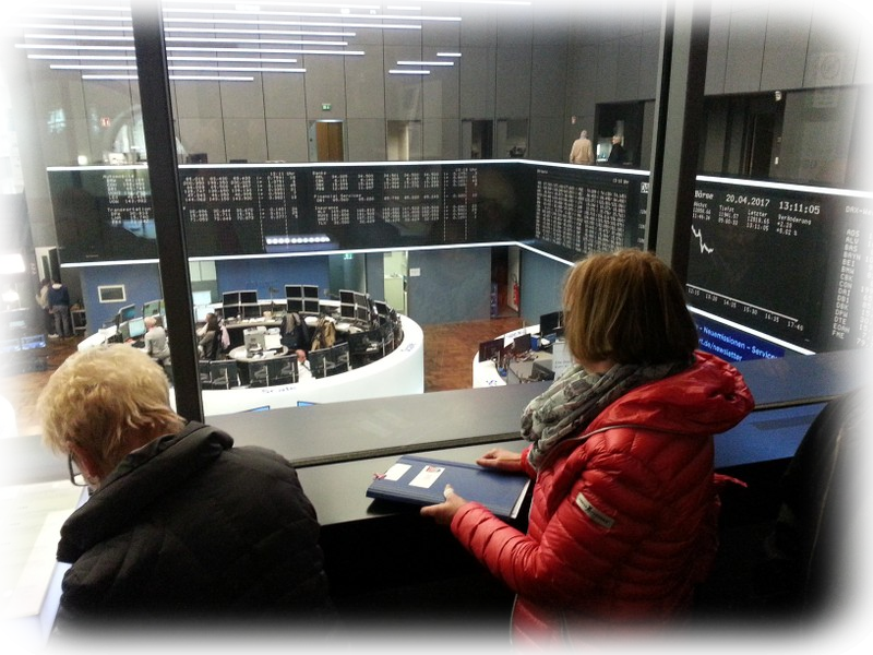 Nach dieser Einstimmung und Personenkontrolle erhielten die Teilnehmer in einem ca. 1,5 stündigem Einführungsvortrag einen generellen Überblick über die Börsen in Deutschland und weltweit. Die Wertpapier-Börse in Frankfurt ist eine von 7 deutschen Wertpapier-Börsen; sie wickelt ca. 90 % des WP-Handels in Deutschland ab und gehört als einzige zur Deutschen Börse; die anderen Börsen haben andere Betreiber. Weltweit ist sie die viertgrößte WP-Börse. An der Frankfurter WP-Börse sind ca. 10500 Aktien (davon ca. 640 deutsche) aus mehr als 130 Ländern notiert. Von den etwa 5000 Mitarbeitern sind nur 1500 im eigentlichen Börsengeschäft tätig, die anderen im IT-Bereich.